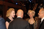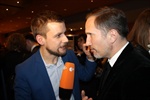 Als ich mein Glas Wein zahlen will, lacht mich Torsten aus. Alles gratis. Auch Champagner. So viel Frau will. Und bevor alle aus dem Saal stürmen, soll ich doch mal Richtung Essen schauen. In jedem Foyer ein anderer Spitzenkoch. Gerade als ich mir ein Rote-Bete-Kartoffel-Risotto mit Meerrettichschaum und Gartenkresse holen wollte, fragten mich die Herren hinter mir, ob ich denn nicht lieber Gemüsemaultaschen mit Pinienkernschmelze, Waldpilzen und Gewürzveloute hätte. Und so kam es, dass ich mit Ulli Zelle und den Herren vom Rbb Fernsehen einen Stock höher zu Abend aß. Der Ulli, der kennt wirklich jeden hier. Und jeder kennt ihn.