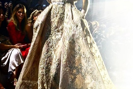 Elie Saab bleibt seinem Credo treu. Traumroben für Prinzessinnen werden in Paris vorgeführt. Überdimensionale Blumenprints auf Rokoko-Röcken, byzanthinisch opulente Stickereien und Pailletten und ein monumentales goldenes Brautkleid, das durch das seinerzeitige Brautkleid der Mrs. Saab inspiriert ist.