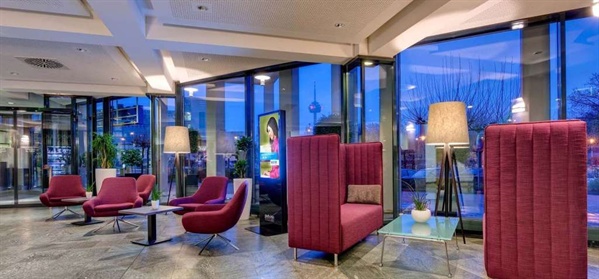 Die Lobby mit Barbereich lädt zum Verweilen ein. Den Gästen stehen Apple Computer Workstations zur Verfügung und die stylische wie bequeme Möblierung bietet sich ideal für Nach- und Vorbesprechungen eines weiteren Gamescom-Wahnsinn-Tages an.
