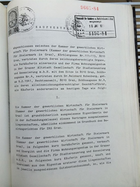 Damals als Dr. Hohenberg die Liegenschaft von der Wirtschaftskammer Steiermark, vertreten durch den damaligen Kammerpräsidenten Kaufmann, damals Stoffhändler Geißler, kaufte, waren diese Liegenschaften mindestens 50 Millionen Schilling , eher 100 Millionen als 50 Millionen wert. Dies war Dr. Hohenberg bestens bekannt, weil er zum Beispiel den Kaufvertrag Keesgasse 11 und andere gemacht hat und die damaligen Kaufpreise mit dem Kaufpreis für Liegenschaften der Wirtschaftskammer selbstverständlich verglichen hat.