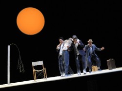 Bühnenbildner Karl-Ernst Herrmann hat neben dem unumgänglichen Godot-Baum, an dem man sich nicht einmal mehr erhängen kann, eine Wippe auf die Bühne gebracht, auf der die Schauspieler balancieren und ihre Figuren mehr als einmal zum Kippen bringen. Bis sie wie Käfer auf dem Rücken liegen, und aufstehen gar nicht mehr möglich ist.